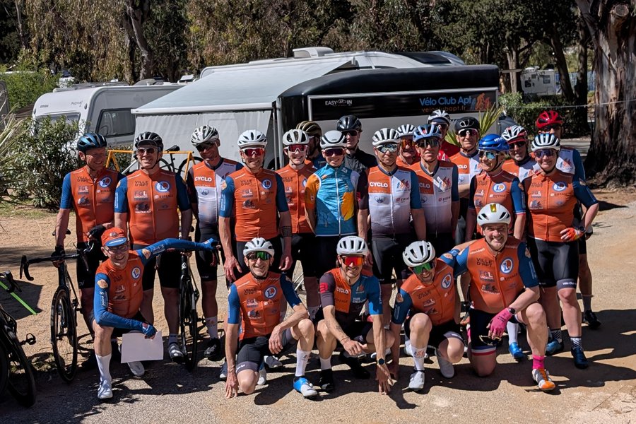Comme il est désormais de tradition, notre club s’est retrouvé en stage pour le weekend de Pâques. Après l’Hérault et la Drôme, c’est à Cavalaire (83) que nous nous sommes réunis pendant trois jours, une grosse trentaine de personnes et 22 sur le vélo. Vendredi, les premiers arrivés n’ont pas pu résister à sortir les vélos pour une boucle de près de 100km, permettant de vérifier la bonne entente entre cycliste et automobilistes, car le trafic est ici assez dense, en tous cas bien plus que chez nous. Le samedi, direction le Canadel et la route des crêtes, où le panorama est exceptionnel. Deuxième ascension du Canadel et direction Cogolin pour en terminer d’une première sortie de 80km. Dimanche, c’est la longue sortie : près de 140km avec 2000m D+ avec comme objectif la montée vers le sanctuaire de Notre Dame des Anges. La cohésion a été parfaite pour faire cohabiter les différences de niveau. Lundi, sortie de récup, avec la montée du Canadel côté nord, rallongée vers la route des crêtes par quelques téméraires. Chaque jour, apéro et diner en commun, comme toujours dans la bonne humeur. Ainsi va la vie au Vélo Club Apt !