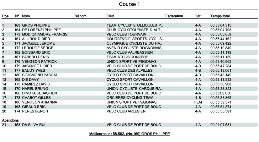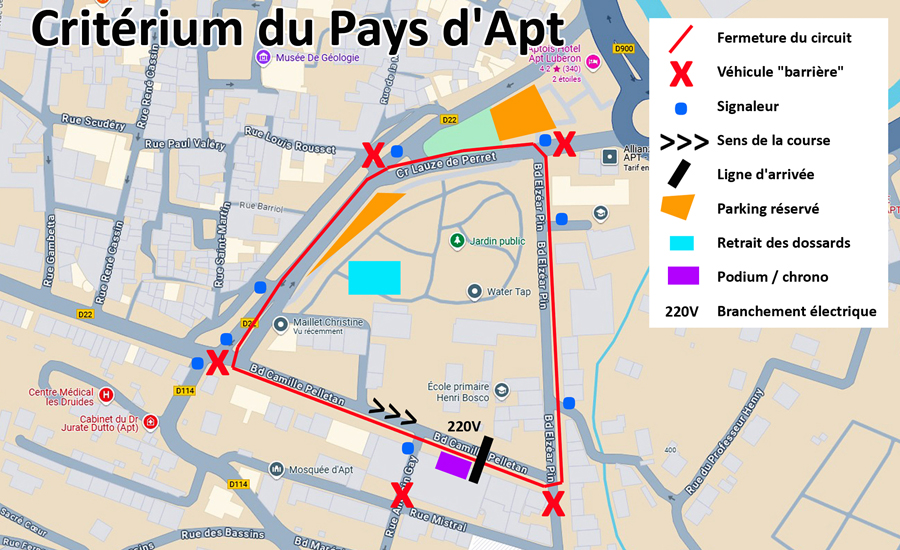 Le circuit est entièrement fermé à toute circulation par les Services de la Villed’Apt. Deux secouristes sont sur place du début à la fin des épreuves. Les coureurs doublés ne sont pas obligés d’abandonner, mais ils ne doivent pas gêner le peloton lorsqu’ils prennent un tour de retard. Ils peuvent suivre, mais ne sont pas autorisés à prendre part, ni au sprints intermédiaires, ni au sprint final.