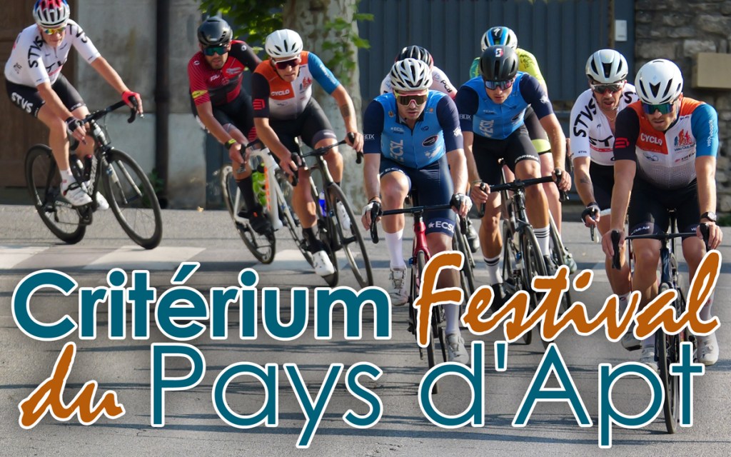 Le Critérium Festival du Pays d’Apt est une course festive, en centre-ville, organisée sous l’égide de l’UFOLEP mais ouverte aux licenciés FFC ou FSGT pour les adultes, et organisée sous l’égide de la FFC pour les catégories U15 et U17. Il est prévu à Apt, le dimanche 17 mai en semi-nocturne, jour de la fête de la musique.