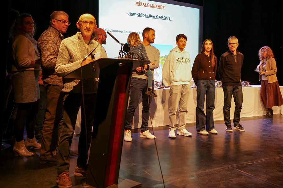 La remise des récompenses sportives de la ville d’Apt réunit chaque année tous ceux qui mettent en avant le Pays d’Apt lors des compétitions toutes disciplines confondues, par leurs performances ou leur engagement en tant que dirigeant. Hier, vendredi 21 novembre, Robert TORNEY, notre secrétaire, a eu l’honneur de présenter notre club face une salle des fêtes comble. Depuis deux ans, notre club est mis à l’honneur. Côté performances, nous sommes présents du niveau départemental au niveau international. Nous comptons cette année quelques champions de Vaucluse et trois champions régionaux : Romy MARTINCIC, championne régionale FFC sur route, Sylvain ROBERT et Bruno CAVELIER, champions régionaux de cyclo-cross UFOLEP. Michèle CAVELIER vient de remporter la médaille de bronze lors du Championnat d’Europe UEC de cyclo-cross en Slovaquie il y a dix jours. Voici les licenciés du Vélo Club Apt récompensés par la ville cette année. Romy MARTINCIC : championne départementale et régionale FFC en catégorie cadette. Elle portera nos couleurs pour sa première année junior. Yanis DUVIVIER : notre ambassadeur pour la jeunesse. Il a remporté cette année, toutes les courses sur route UFOLEP auxquelles il a participé. Dimanche dernier, il a remporté le cyclo-cross FFC de Plan-de-Cuques dans la catégorie Cadet, alors qu’il n’est que première année. Sylvain ROBERT : champion régional UFOLEP de cyclo-cross à domicile, à Gargas, et champion départemental UFOLEP sur route à Vaison-la-Romaine. Il a aussi remporté le Critérium d’Apt en toutes catégories le 21 juin dernier. Jean-Sébastien CAROSSI : un très bon coureur, mais aussi un dirigeant fidèle du Vélo Club Apt depuis de nombreuses années. C’est lui qui s’investit quotidiennement pour proposer tous les parcours de nos sorties club, en fonction de la météo et des impératifs de chacun.