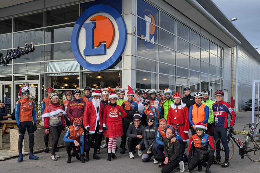 Le samedi précédant Noël, c’est le jour de la traditionnelle Rando de Noël gratuite et ouverte à tous, depuis désormais trois ans. Cette année, grâce à partenaire Leclerc Apt, nous avons proposé une nouveauté de taille : un repas au retour de la sortie. Une quarantaine de cyclistes c’étaient donné rendez-vous le matin, devant la cafétéria Leclerc, une bonne partie arborant les couleurs du Père Noël ou quelques accessoires rappelant cette fête familiale. Traversant Apt, le peloton à dominante rouge a pris la direction de Bonnieux, Ménerbes, avant de revenir par la véloroute du Calavon, soit une boucle sans difficulté d’une cinquantaine de kilomètres. Comme il se doit, les membres du Vélo Club Apt et leurs familles se sont retrouvés autour d’une bonne table pour une belle tranche de vie, d’amitié et de convivialité. Prochaine randonnée ouverte à tous : la Rando du Carnaval, le samedi 21 février.