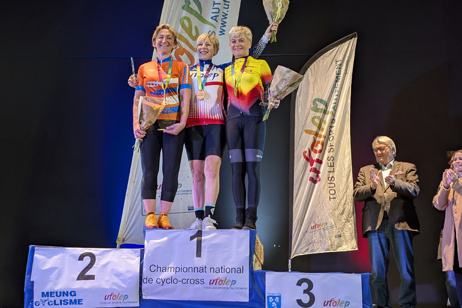 Championnat National Ufolep de cyclo-cross 2026, les 7 et 8 février à Meung-sur-Loire : voici les résultats de nos coureurs. Féminines 50 ans et plus : Michèle CAVELIER, 3e et médaillée de bronze (14 engagées) Féminines 40/49 ans : Laurence METGE, 22e (23 engagées) Messieurs 60 ans et plus : Bruno CAVELIER, 55e et Jeff GOERGEN, 74e (96 engagés) Messieurs 50-59 ans : Rudy CLERCX, 108e (120 engagés) Messieurs 40-49 ans : Jérôme DUVIVIER, 34e (99 engagés) Jeunes 15-16 ans : Yanis DUVIVIER, 16e (60 engagés) Merci à Robert TORNEY pour l’assistance technique tout le week-end ! Les courses du samedi (féminines, 50-59 et 60+) se sont déroulées sur un parcours particulièrement boueux, nécessitant d’effectuer en courant la moitié de la course. Les courses du lendemain (40-49 et 15-16) ont bénéficié du retour du soleil, offrant un parcours plus équilibré mais extrêmement technique. C’est la première fois que notre club était représenté sur un Championnat National avec une telle équipe, pour vivre un weekend de convivialité, d’émotions et de bonne humeur, avec le podium de Michèle comme cerise sur le gâteau. Bravo à tous et retour en images… PS : les maillots de club n’ont pas changé, ce sont ceux du Comité de Vaucluse, dont l’équipa était constitués de sept membres de notre club, plus le sympathique Quentin BERTRAND, 35e dans la course 20-29 ans.