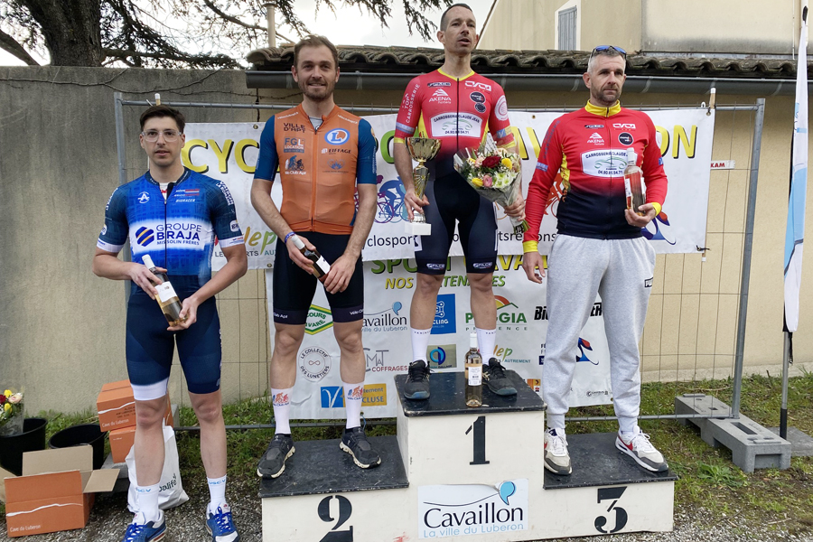 LES PODIUMS Messieurs 60 ans et plus 1, PEREIRA JOSÉ (VALCROS TEAM) 2, BELHOMME ALAIN (UCDV) 3, CAVELIER BRUNO (VC APT) Messieurs moins de 50-59 ans 1, SENECHAL YANNICK (VC TOURVAIN) 2, OCCHIPINTI MICHEL (VALCROS TEAM) 3, BEDINI BRUNO (TCDV) Messieurs 40-49 ans 1, PYPE MATHIAS (VALCROS TEAM) 2, GENTHON LIONEL (ISATIS CYCLING TEAM) 3, GOUX NICOLAS (BEZIERS MC) Messieurs 30-39 ans 1, SCHMITZ IVAN (ES CAVAILLON) 2, TANDLER NICOLAS (VC BARJOLAIS) 3, GADOIS KEVIN (AC MARSEILLE EST) Messieurs 17-29 ans 1, BERTRAND QUENTIN (VC LE THOR GADAGNE) 2, EPAILLY MAEL (OCCA) 3, BEDON JULES (VC LE THOR GADAGNE) Jeunes 15-16 ans 1, DUVIVIER YANIS (VC APT) 2, PYPE ADAM (VALCROS TEAM) 3, BARRET SWAN (CA PEYMEINADE) Féminines 1, MOTTE LOU-ANNE (TCDV) 2, CAVELIER MICHÈLE (VC APT) 3, POMMIER MANON (VC BOLLÈNOIS)