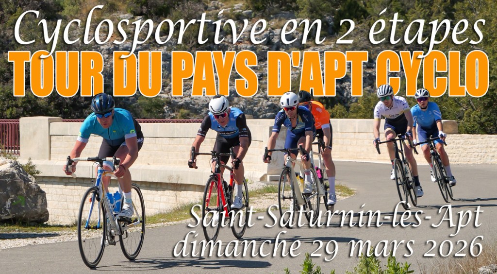 Le Tour du Pays d’Apt Cyclo est une épreuve de type cyclosportive en deux étapes, organisée sous l’égide de l’UFOLEP mais ouverte à tous, licenciés FFC ou FSGT et non licenciés. Elle s’est déroulée le dimanche 30 mars 2025 à Saint-Saturnin-lès-Apt. Rendez-vous le 29 mars 2026 pour la deuxième édition !